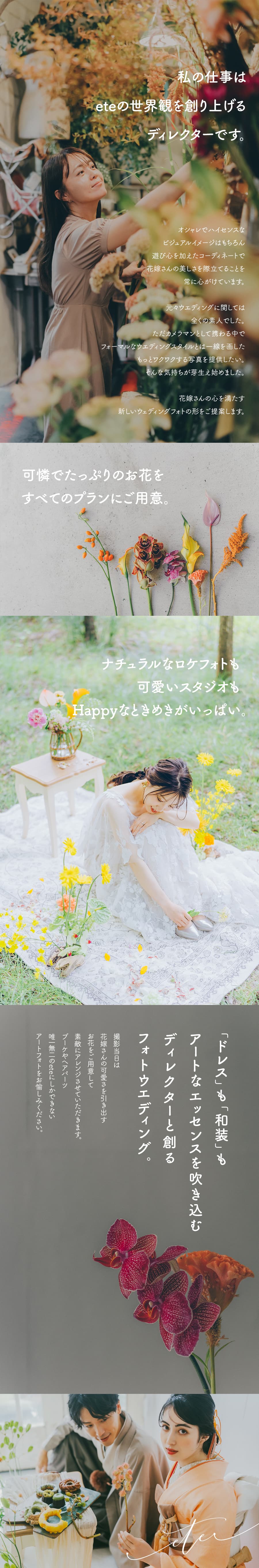 ただカメラマンとして携わる中でフォーマルなウェディングスタイルとは一線を画したもっとワクワクする写真を提供したい。そんな気持ちが芽生え始めました。新しいドレスのデザインを考えたり可愛くて可憐なお花をセレクトする時間がとっても楽しくてeteではディレクターとして携わっています。
